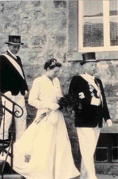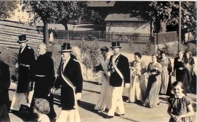 Josef & Maria Schulte-Bories 1956 Königspaar beim Ausmarsch 1956 Oberst: Bernhard Funke, Pater Adalbert, Oberstadjudant: Josef Vonnahme,